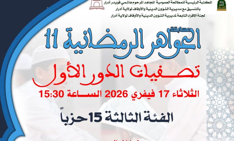 Cette manifestation coranique, devenue un rendez-vous annuel incontournable sur la scène religieuse et culturelle locale, confirme la position d’Adrar en tant qu’espace incubateur du savoir et du Coran, et met en lumière les efforts des institutions d’encadrement pour nourrir les jeunes talents et affiner leurs capacités, en ligne avec la mission de l’État de consolider les valeurs spirituelles en Algérie. L’autorité organisatrice a appelé tous les concurrents à respecter l’horaire précisé, le mardi 17 février 2026 à 15h30, soulignant que la présence à l’heure est une condition fondamentale pour assurer le bon déroulement de cette étape éliminatoire des Joyaux du Ramadan 11.
