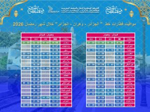 La Société Nationale des Transports Ferroviaires a annoncé les horaires de circulation des trains durant le mois de Ramadan 2026 sur la ligne Alger – Oran – Algérie.
