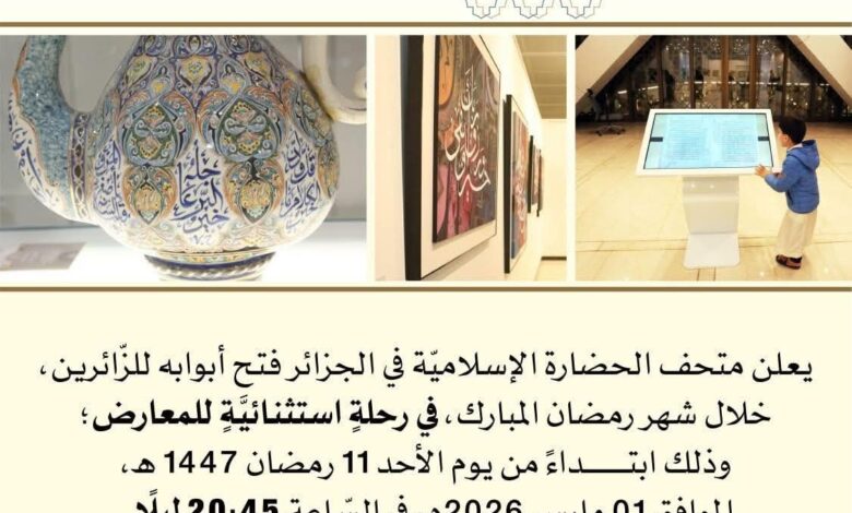 Le Musée de la Civilisation Islamique d’Algérie, situé dans le minaret de la Mosquée d’Alger, accueille ses visiteurs pendant le mois sacré du Ramadan, dans le cadre d’une initiative culturelle qui donne aux amateurs d’art et de patrimoine l’opportunité d’embrasser le parfum de l’histoire et la magie de l’artisanat arabe au sein d’espaces d’exposition célébrant l’esthétique de la créativité islamique, puisqu’il a été décidé d’ouvrir les portes à partir du dimanche 11 Ramadan 1447 AH, correspondant au 1er mars 2026 après JC, à 20h45 à nuit. La pré-inscription est validée en scannant le QR code pour garantir que les visites soient organisées dans les meilleures conditions. Le musée accueille actuellement une exposition, Cheikh des calligraphes algériens, Muhammad bin Said Sharifi, qui offre aux visiteurs un parcours riche qui met en valeur des peintures calligraphiques distinguées, des modèles originaux de ses Corans, des certificats et des médailles, et ses travaux de critique artistique, en plus de ses propres plumes et outils, les licences de ses étudiants et d’autres documents qui relatent son parcours scientifique et artistique et révèlent la profondeur de son expérience au service de la calligraphie arabe. Cette démonstration représente l’occasion de souligner le statut de la lettre en tant qu’incarnation d’une identité culturelle intégrée, car la visite se transforme en une expérience visuelle et spirituelle qui fait comprendre au destinataire que la calligraphie n’est pas seulement une écriture, mais plutôt la mémoire d’une nation et une beauté renouvelée qui peut être vue, ressentie et préservée pendant des générations.