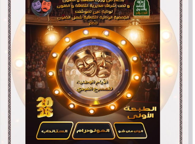 L’État d’Aïn Temouchent se prépare à accueillir un événement théâtral de qualité, l’association culturelle d’État « Shaml al-Funun » annonçant le début de la réception des candidatures pour la participation aux Journées nationales du théâtre solo, qui seront organisées du 26 au 29 mars 2026, dans le cadre d’une manifestation artistique organisée avec le soutien du ministère de la Culture et des Arts et sous la supervision de la Direction de la Culture et des Arts de l’État d’Aïn Temouchent. Cette initiative parie sur la mise en valeur des énergies créatrices dans les arts de la performance individuelle et sur l’ouverture d’un espace de compétition et d’échange entre les praticiens des différentes régions du pays. La société organisatrice a fixé au samedi 28 février 2026 la date limite de réception des offres, invitant ceux qui souhaitent consulter le détail de la participation via le lien technique et conditions techniques prévu à cet effet, avec pré-inscription électronique obligatoire via le formulaire disponible sur Internet. Le concours comprend diverses formes d’expression, à savoir le monodrame, le one-man show et le stand-up, à condition que les œuvres soient présentées en arabe classique, amazigh ou arabe familier, tout en respectant les délais précisés pour chaque style. Les monodrames et les one-man shows durent entre 45 et 60 minutes, tandis que le temps de stand-up est fixé entre 20 et 35 minutes, en mettant l’accent sur le fait de ne pas compromettre les symboles de souveraineté ou d’unité nationale et sur la nécessité que les contenus soient compatibles avec les valeurs sociétales et la morale publique. La direction de l’événement accepte de nouvelles œuvres et des spectacles précédemment présentés en dehors du cadre du concours peuvent être programmés, à condition de s’engager à présenter la version approuvée par le comité de visionnage sans modifications fondamentales, et à envoyer un enregistrement complet de l’œuvre avec une qualité audio et vidéo claire et sans effets de montage supplémentaires, en évitant l’utilisation de feu réel ou de tout matériel pouvant présenter un danger à l’intérieur des espaces d’exposition, en respectant l’équipement technique disponible dans les salles désignées et en respectant le calendrier des répétitions et des représentations. Sur le plan organisationnel, les équipes participantes supportent les frais de transport, de décoration, de costumes, de maquillage, d’accessoires et tout matériel d’éclairage supplémentaire, ainsi que la responsabilité légale liée aux droits de propriété intellectuelle, tandis que l’association organisatrice se réserve le droit de photographier les performances et de les exploiter à des fins d’archivage, d’information et de promotion sans compensation financière, avec la nécessité de respecter les lois en vigueur en Algérie et le règlement intérieur de la manifestation. La participation est ouverte aux acteurs individuels, qu’ils soient indépendants ou affiliés à des associations, coopératives ou institutions artistiques, avec l’interdiction de combiner plus de deux catégories et de limiter une représentation, et l’exigence que l’âge de chaque participant ou accompagnateur ne soit pas inférieur à 18 ans, en plus d’imposer la discipline, la bonne conduite et le respect des décisions des comités d’organisation et de projection, en plus d’envisager d’assister aux représentations du reste des équipes en compétition dans le cadre de l’esprit d’échange culturel et de formation artistique, et toute violation de ceci peut exposer le personne concernée à l’avertissement ou à l’exclusion. Chaque groupe s’engage également à apporter une affiche d’exposition imprimée de haute qualité et une brochure d’introduction dans la langue nationale comprenant des données techniques, à utiliser pour présenter les œuvres, promouvoir la démonstration et la documentation culturelle. Le comité de sélection s’appuie dans son évaluation sur la qualité du jeu d’acteur, la vision de la mise en scène, le degré d’originalité et d’innovation et le degré d’harmonie entre le texte et l’incarnation scénique, à condition que ses décisions soient définitives et sans appel, et que la soumission d’une demande de participation constitue une approbation implicite de toutes les dispositions organisationnelles.