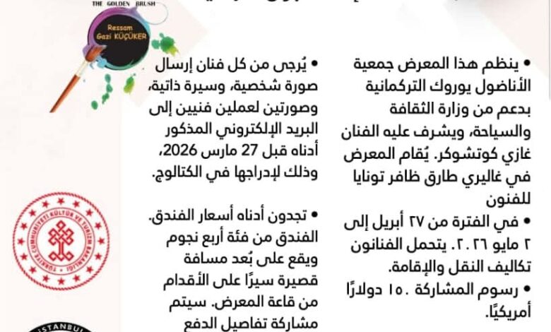 La ville d’Istanbul se prépare à accueillir un événement artistique international distingué représenté par la 7ème session de l’Exposition internationale de peinture « LE PINCEAU D’OR », une exposition d’art qui ouvre ses portes aux artistes de divers pays, dont l’Algérie, pour exposer leurs expériences créatives dans un espace artistique prestigieux au centre de la ville turque. Cet événement est supervisé par l’association turkmène Anatolie Yürük avec le soutien du ministère turc de la Culture et du Tourisme, et la supervision artistique est assurée par le peintre turc Ghazi Kuçuker. Ressam Gazi KÜÇÜKER, tandis que les activités d’exposition seront accueillies par la Galerie d’Art TARIK ZAFER TUNAYA pendant la période s’étendant du 27 avril au 2 mai 2026, afin que cette date soit un espace de rencontre culturelle et civilisationnelle entre plusieurs écoles et styles artistiques dans une atmosphère d’échange et d’inspiration.