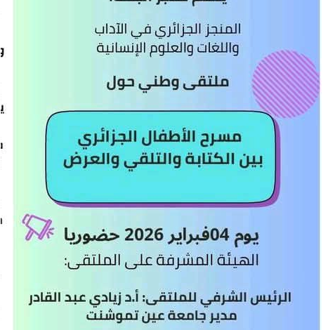 L’Université Belhaj Bouchaib d’Ain Temouchent, représentée par la Faculté des Lettres, des Langues et des Sciences Sociales, Département de Langue et Littérature Arabe et le Laboratoire de Recherches Réalisées Algériennes en Arts, Langues et Sciences Humaines, organise le 4 février 2026 un forum national intitulé Théâtre pour enfants algériens entre l’écriture, la réception et la présentation, en présence sous la tutelle du Ministère de l’Enseignement supérieur et de la Recherche scientifique et sous la tutelle administrative d’Ain Temouchent Belhaj. Université Bouchaïb. Cette nomination scientifique s’inscrit dans le contexte de l’intérêt croissant pour la littérature jeunesse en général et le théâtre en particulier comme domaine créatif et pédagogique qui contribue à façonner la conscience de l’enfant et à développer ses capacités linguistiques, émotionnelles, esthétiques et culturelles. Le théâtre est un médium artistique efficace qui transforme le texte littéraire en un acte vivant, visuel et sonore, capable de consolider les valeurs et de construire des comportements positifs chez les jeunes, que ce soit à travers la participation de l’enfant au spectacle ou à travers son accueil au sein de l’école ou des espaces culturels.