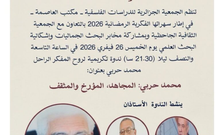 Dans le cadre de ses soirées intellectuelles du Ramadan pour l’année 2026, l’Association algérienne des études philosophiques, bureau de la capitale, en coordination avec l’Association culturelle Al-Jahhia et avec la participation de laboratoires de recherche spécialisés dans l’esthétique et la problématique de la recherche scientifique, organise une rencontre en l’honneur de l’esprit du défunt penseur Muhammad Harbi, sous le titre Muhammad Harbi, le Moudjahid, Historien et Intellectuel, jeudi soir 26 février 2026, à 21h30 au siège de l’association situé au 8 rue Reda. Houhou à Alger. Cette nomination intellectuelle est encadrée par le sociologue Nasser Djabi et l’historien Daho Djerbal, qui évoquent la lutte et le parcours scientifique du défunt homme, ses contributions à l’écriture de l’histoire nationale et à l’analyse des transformations politiques et intellectuelles, ainsi que sa position au sein de l’élite intellectuelle qui a accompagné la formation de la conscience moderne en Algérie. Cette activité s’inscrit dans le contexte de la valorisation des icônes intellectuelles nationales et du rappel de leurs expériences au sein d’un espace de dialogue qui ouvre la voie à la discussion et à l’interaction avec les questions d’histoire, de mémoire et de pensée critique, tout en soulignant que l’invitation est ouverte à tous ceux qui s’intéressent aux affaires culturelles et cognitives et qui souhaitent participer à cette soirée d’honneur.